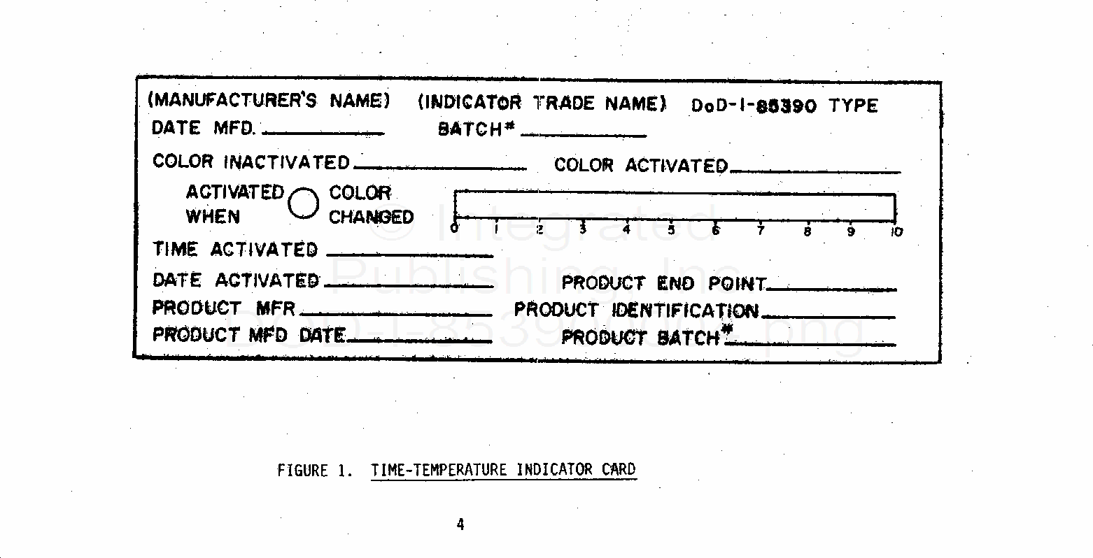 DOD-I-85390 Indicator, Time Temperature, Card, Chemically Activated, MetricThis specification covers a time-temperature controlled, chemically activated, irreversible indicator card for use with time-temperature sensitive, limited shelf life products.